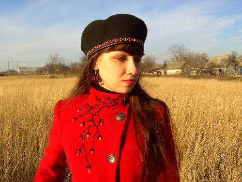 | Описание: Берет окантован тесьмой из бисера, пальто вышито бисером, серьги из бисера + сухое валяние шерсти |